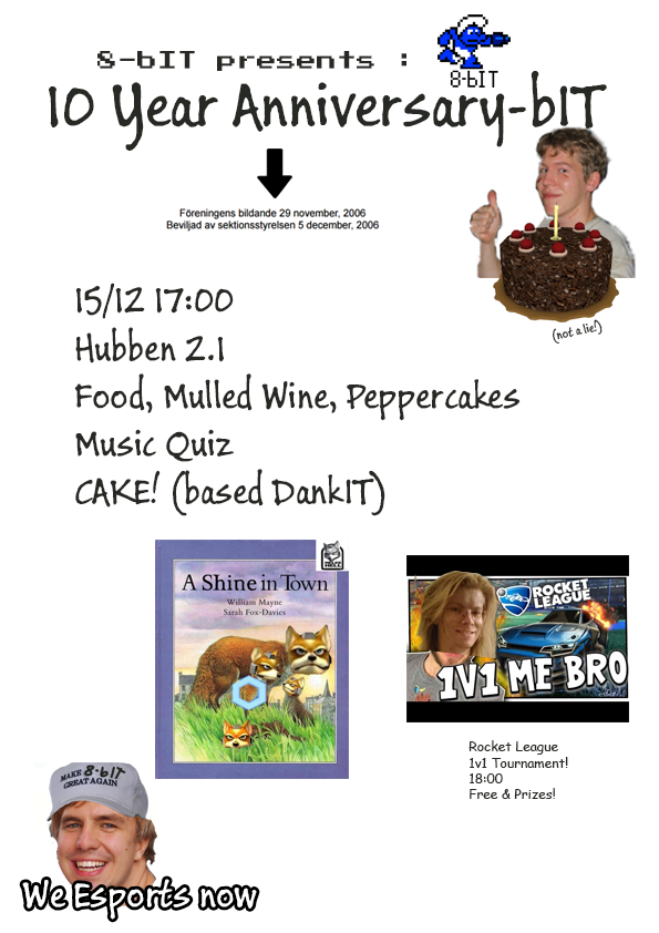 Welcome! Join us for an epic games evening with 8-bIT. We realized we are 10 years old, and also it is christmas. We will be serving gingerbread cookies and Glögg. Food, candy, beverages available. Music Quiz and 1v1 Rocket League tournament at 18:00.