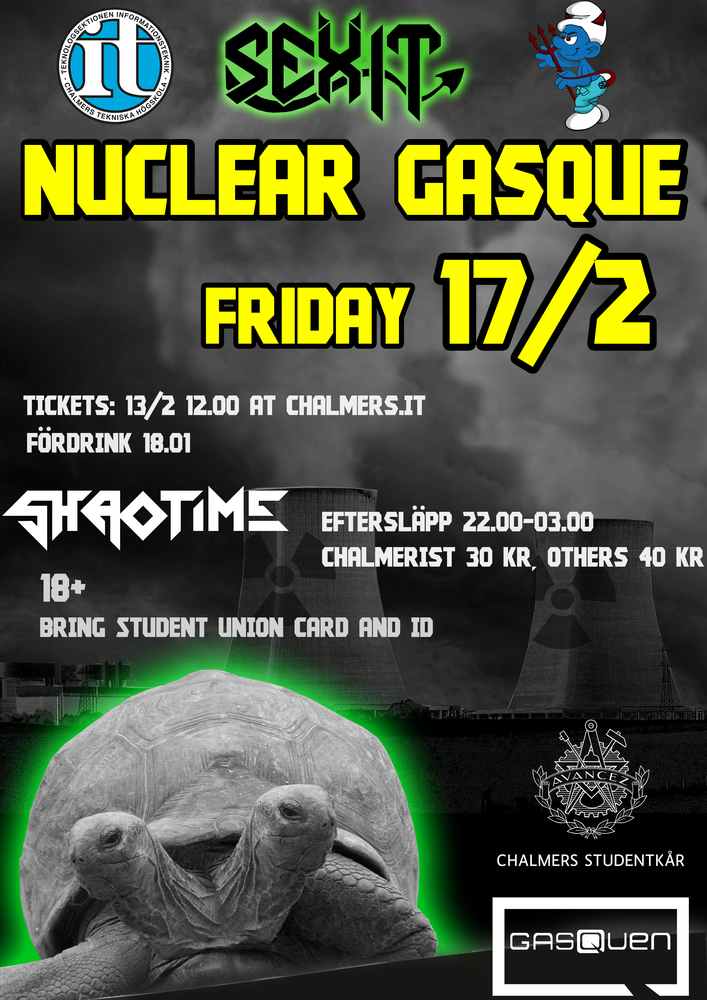 Få svar på dina frågor och fira undergången på sexITs första gasque! Klockan 18.01 fredag den 17/2 drar vi igång med en strålande sittning i Gasquen. Biljettsläpp sker den 13/2 klockan 12.00 på chalmers.it. Priset är 90 kr.