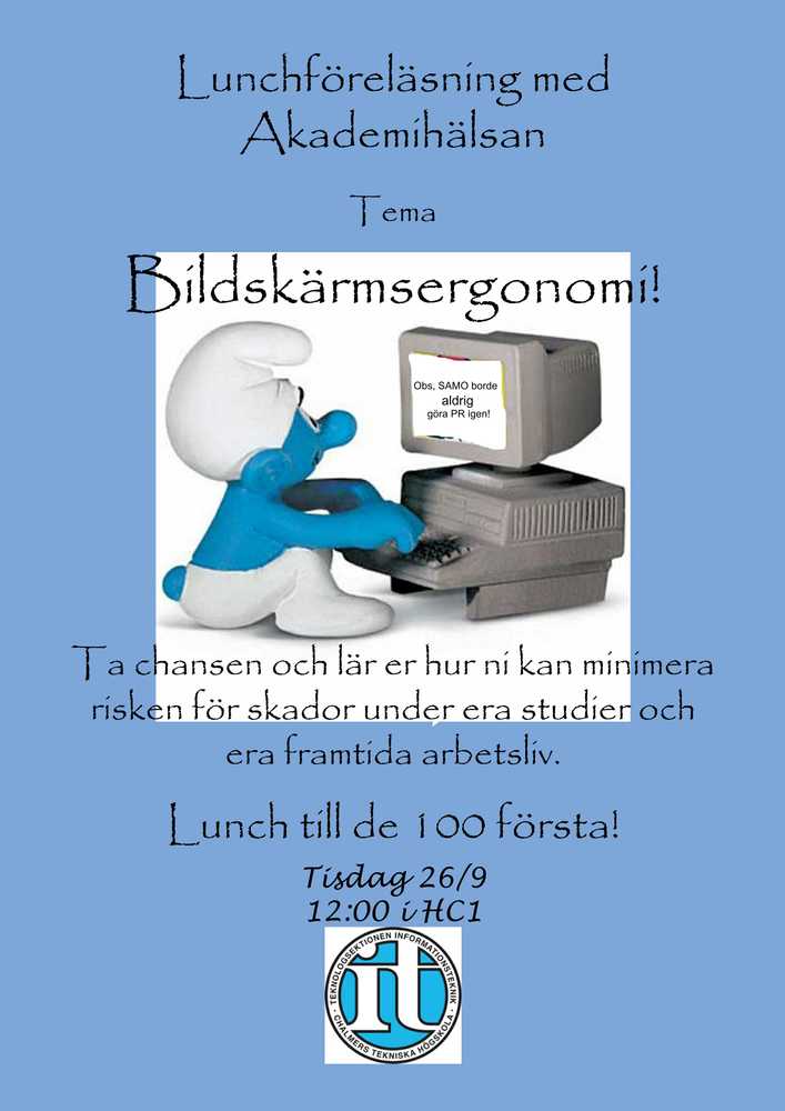 Många av er som läser IT spenderar en del tid framför bildskärmar av olika slag, och sannolikt kommer ni att fortsätta göra det under era studier på IT och under era framtida arbetsliv. Akademihälsan kommer att ge tips på hur man på bästa sätt kan planera sin arbetsplats, arbetsställningar och även rörelser för att minimera risken för skador.