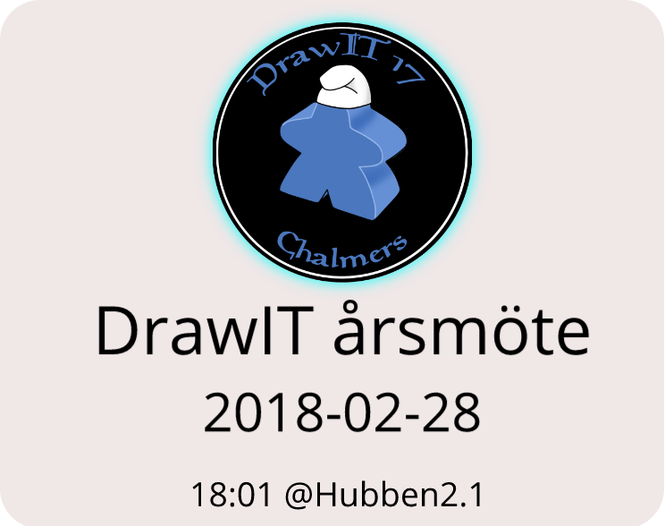 Onsdag 28:e februari klockan 18:01 hålls DrawITs årsmöte, där vi bestämmer DrawITs framtid och väljer in en ny styrelse. Dagordning och budget finns här. Vi ber er skicka in eventuella motioner till oss på drawit@chalmers.it snarast, så vi kan offentliggöra dem i god tid till mötet.