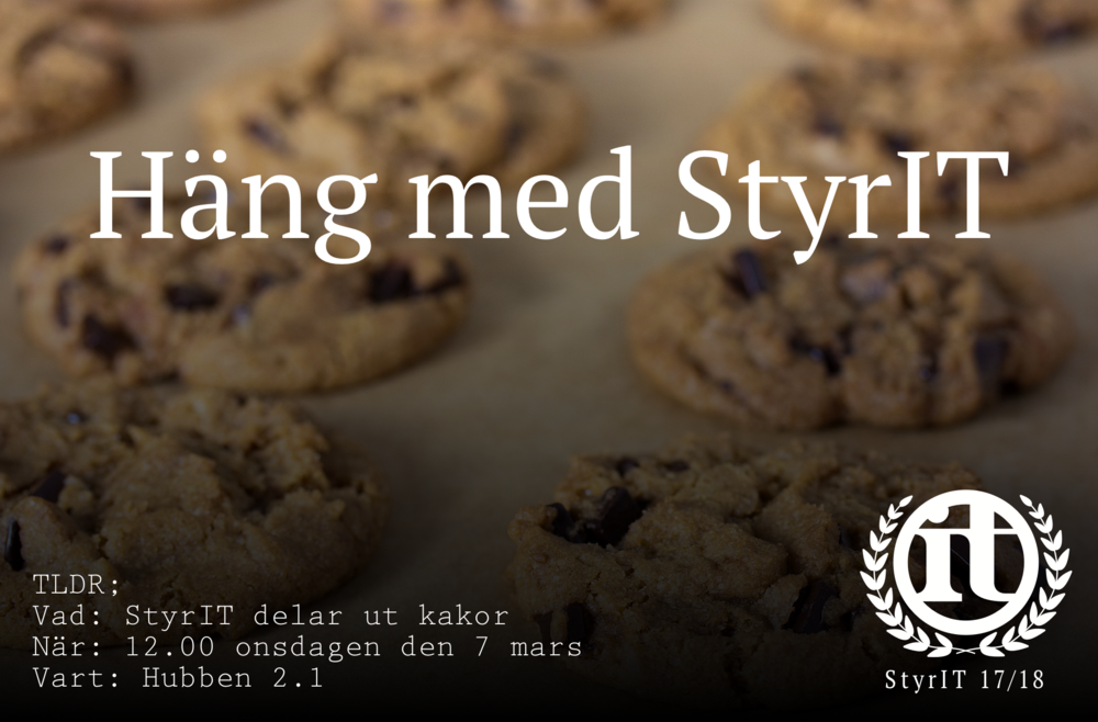 Under lunch nu på onsdag den 7/3 kommer vi i StyrIT att sitta i hubben och dela ut kakor (det ryktas om chocolate chip cookies…). Kom gärna förbi och ställ frågor, snacka eller bara äta kakor!