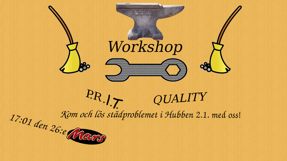 Då är du välkommen till P.R.I.T.’s städworkshop nu på måndag, 26/3, klockan 17.30! Vi kommer att diskutera olika möjligheter för den framtida städningen av hubben och vill mer än gärna få din syn på problemet. Så kom till Hubben och hjälp oss hjälpa Hubben! <3