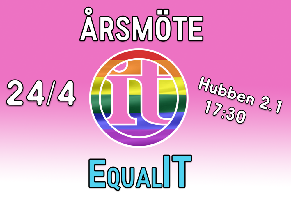 Hejsan! Den 24/4 är det dags för EqualITs första årsmöte någonsin! Brinner du för att göra sektionen till en plats där alla känner sig välkomna? Vill du vara med och anordna grymma föreläsningar, pubbar, workshops eller liknande? Ingenting är bestämt än och vill du ha möjligheten att forma en förening från grunden så kom till Hubben 17:30 den 24 April! Det kommer bli skoj!