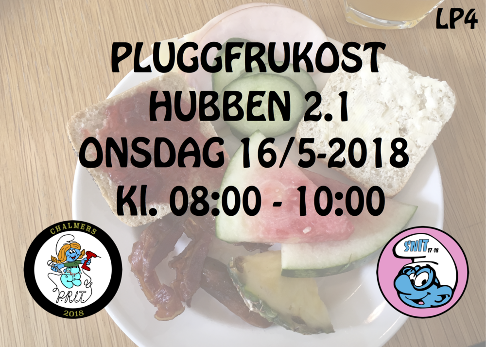Sommaren närmar sig med stormsteg och så även den sista tentaperioden för året. Och vad skulle en tentaperiod utan en pluggfrukost innan vara? P.R.I.T. och snIT bjuder in till läsårets sista pluggfrukost och bjuder som vanligt på goda läckerheter såsom pannkakor, meloner och apelsiner. Välkomna till hubben 2.1, onsdag 16/5, kl. 8:00 – 10:00.