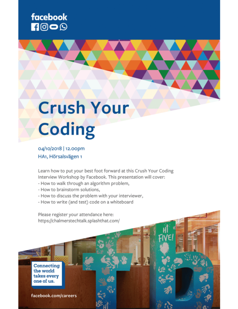 Join Facebook on Thursday 4th October at 12pm at HA1, Hörsalsvägen 1, to learn how to put your best foot forward at this Crush Your Coding Interview Workshop. This presentation will cover: