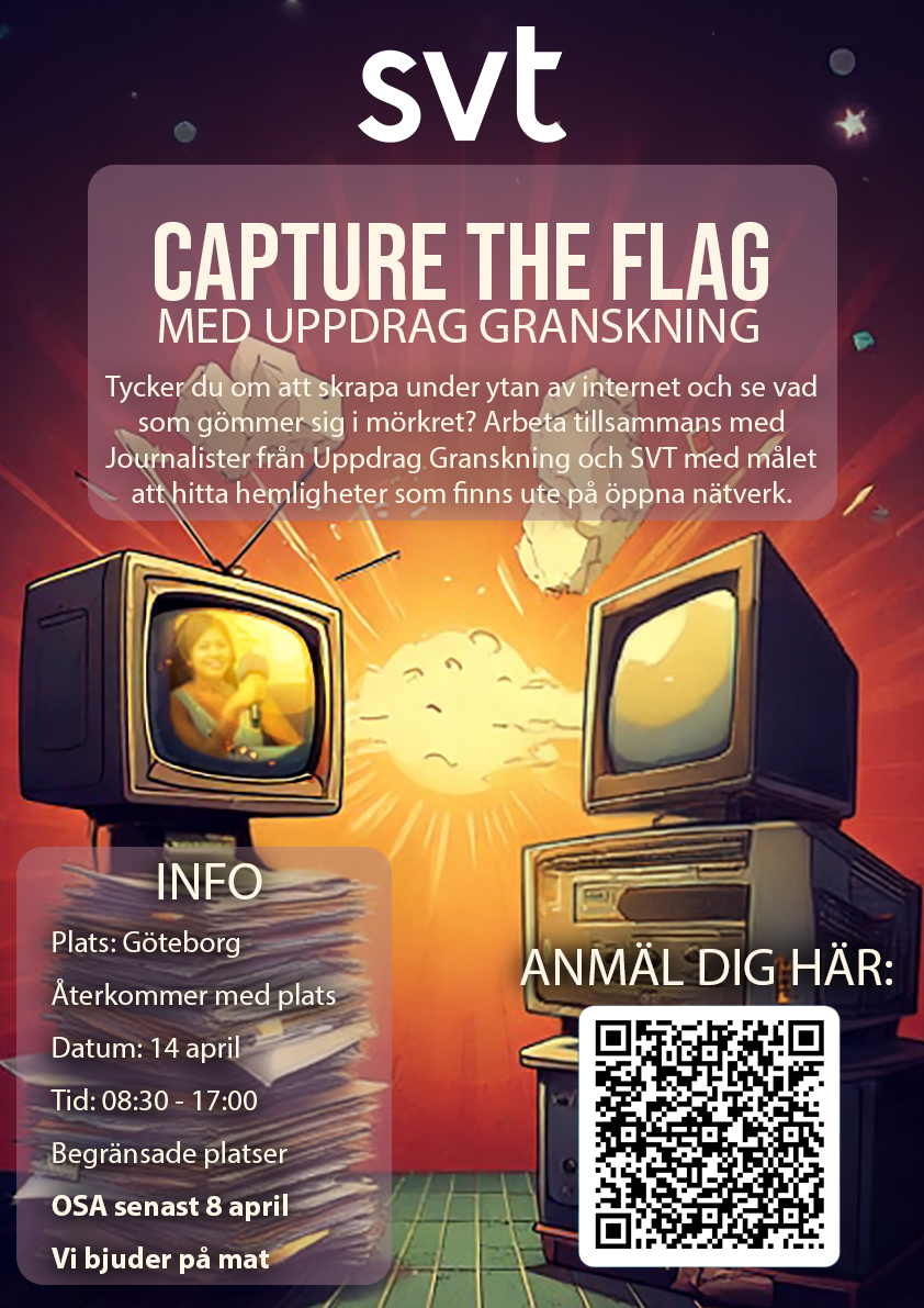 Delta i en CTF olik alla andra. Tycker du om att skrapa under ytan av internet och se vad som gömmer sig i mörkret? Arbeta tillsammans med Journalister från Uppdrag Granskning och SVT med målet att hitta hemligheter som finns ute på öppna nätverk.