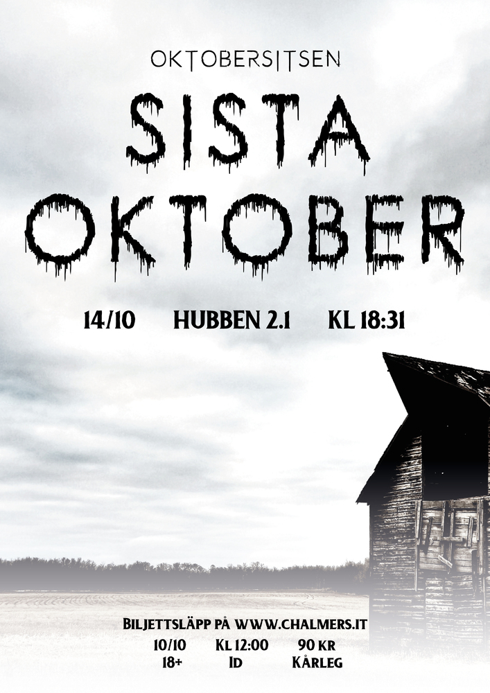 Välkommen på en rysligt bra sittning. Fredagen den 14 oktober öppnas Hubben 2.1 upp för er som vill undkomma bitande kyla och darrande vind. Sittningen börjar 18:31 med fördrink och kommer kosta 90 kr. Efter sittningen kommer vi ha pub, så festen kan fortsätta!
