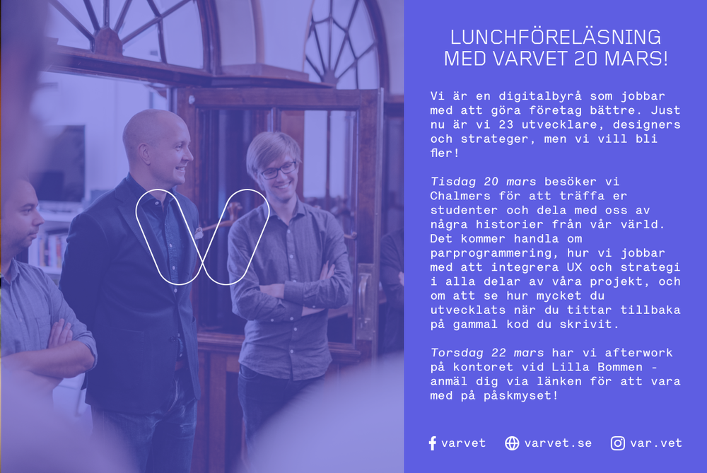 Tisdag 20 mars besöker vi Chalmers för att träffa er studenter och dela med oss av några historier från vår värld. Det kommer handla om parprogrammering, hur vi jobbar med att integrera UX och strategi i alla delar av våra projekt, och om att se hur mycket du utvecklats när du tittar tillbaka på gammal kod du skrivit.