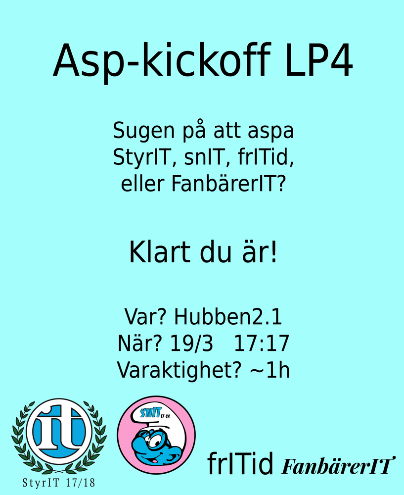 Sugen på att leda sektionen frammåt, aspa StyrIT och snIT!Eller kanske på att hålla sektionen i form, aspa frITid!Fast du kanske är mer intresserad avfinkultur, aspa FanbärerIT!